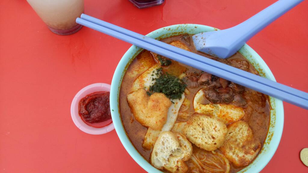 | a bowl of nyonya laksa where I had at this food court ,creamy soup and enormous portion of cockles |